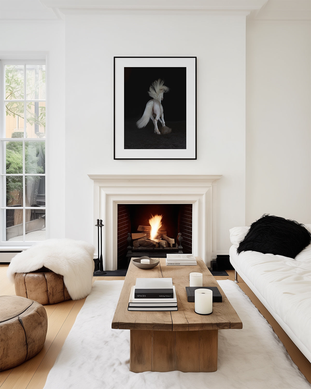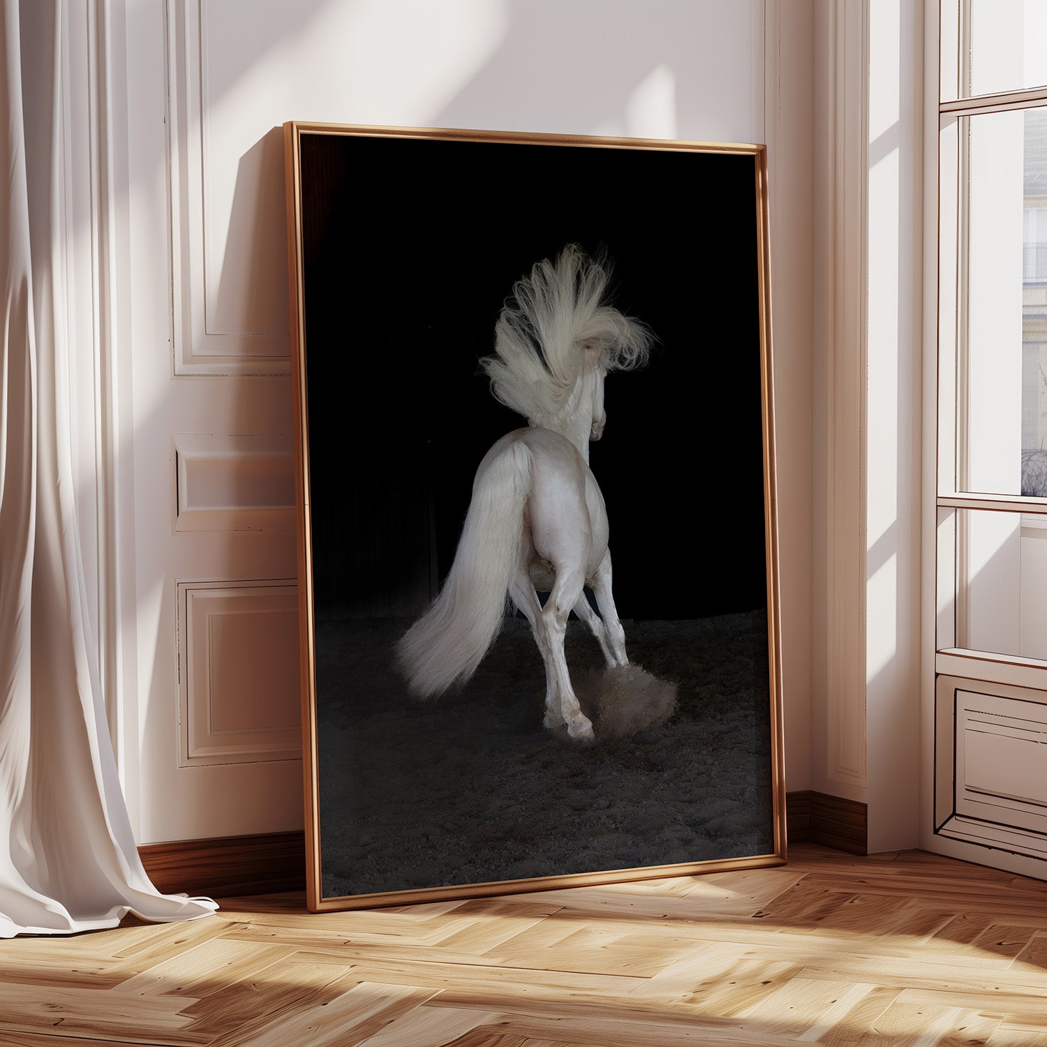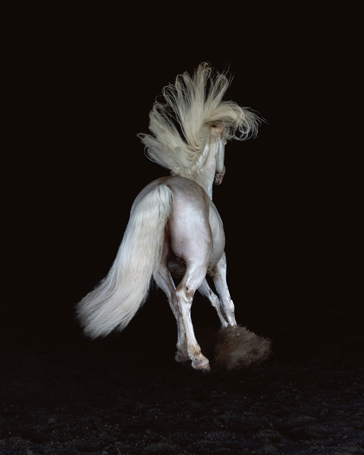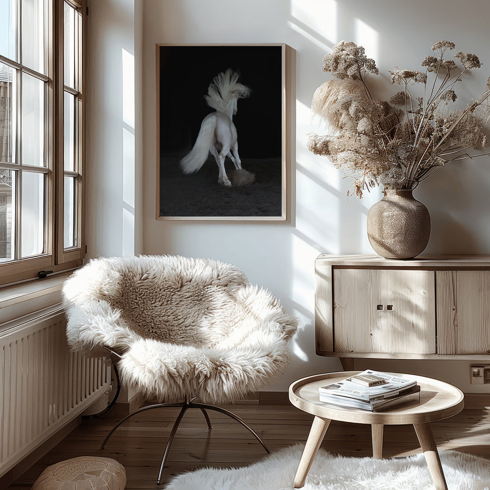 A fine art black and white photographic print, full of energy, emotion and beauty of an impressive Lusitano stallion.