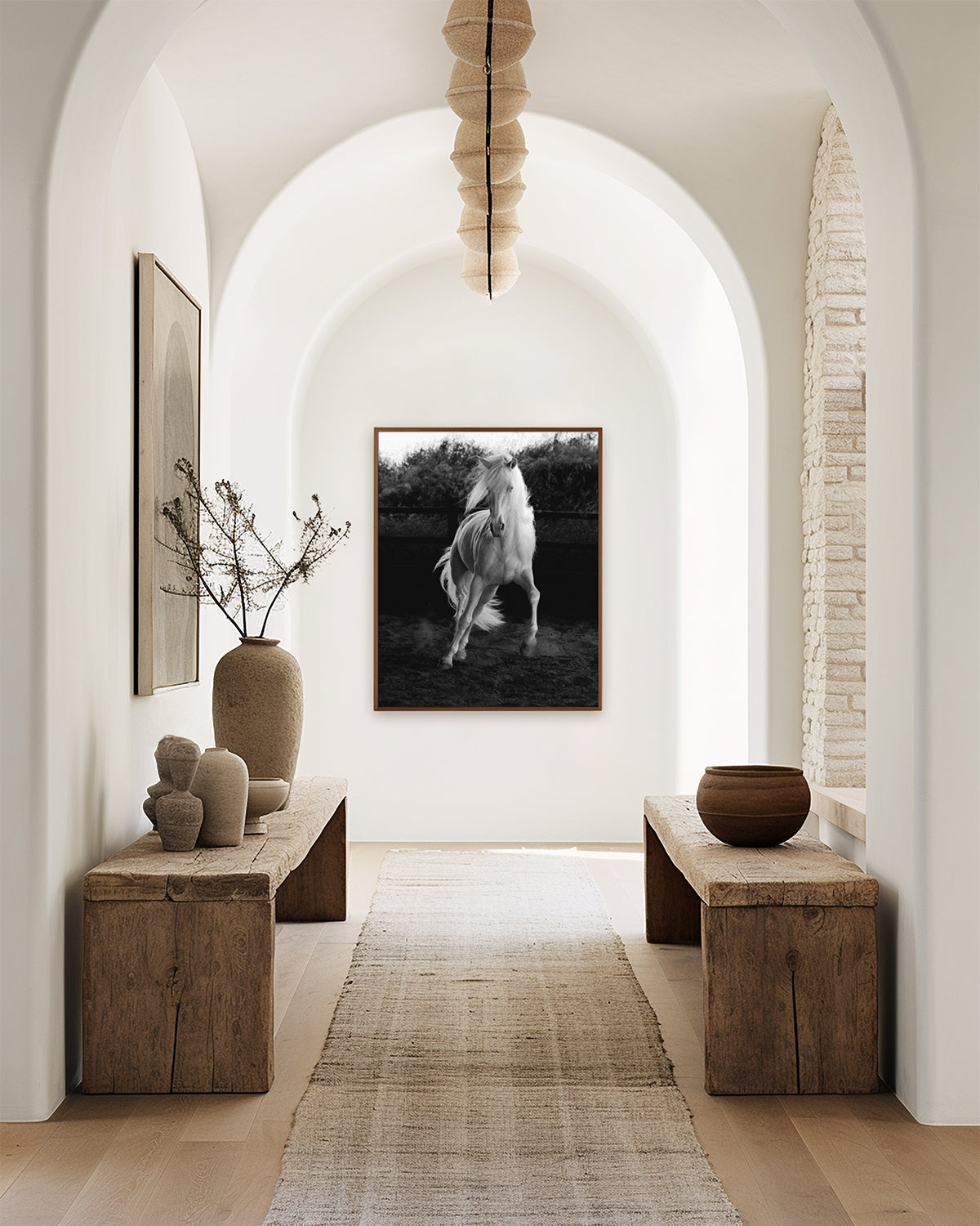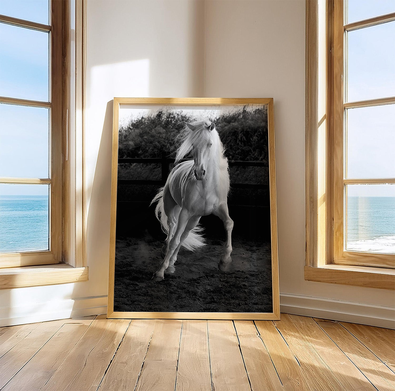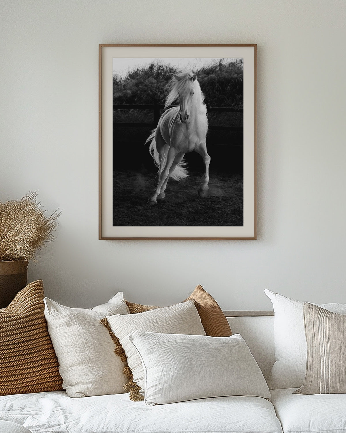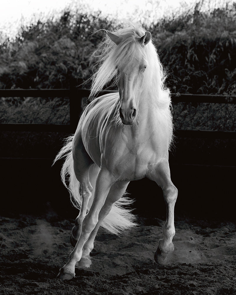 A fine art black and white photographic print, full of energy, emotion and beauty of an impressive Lusitano stallion.